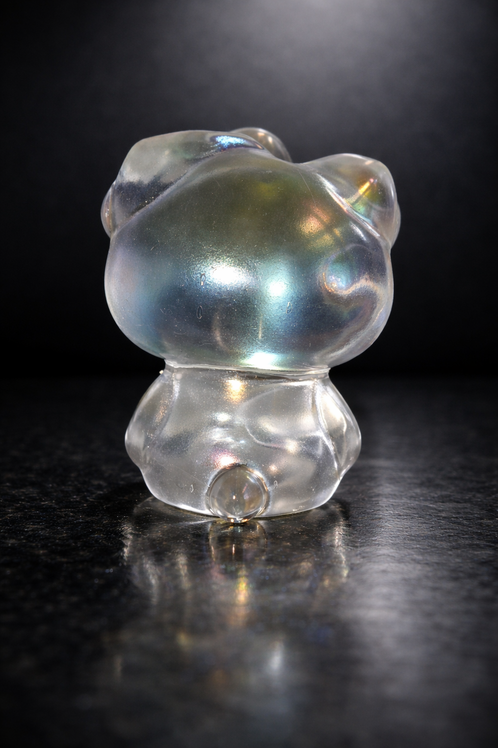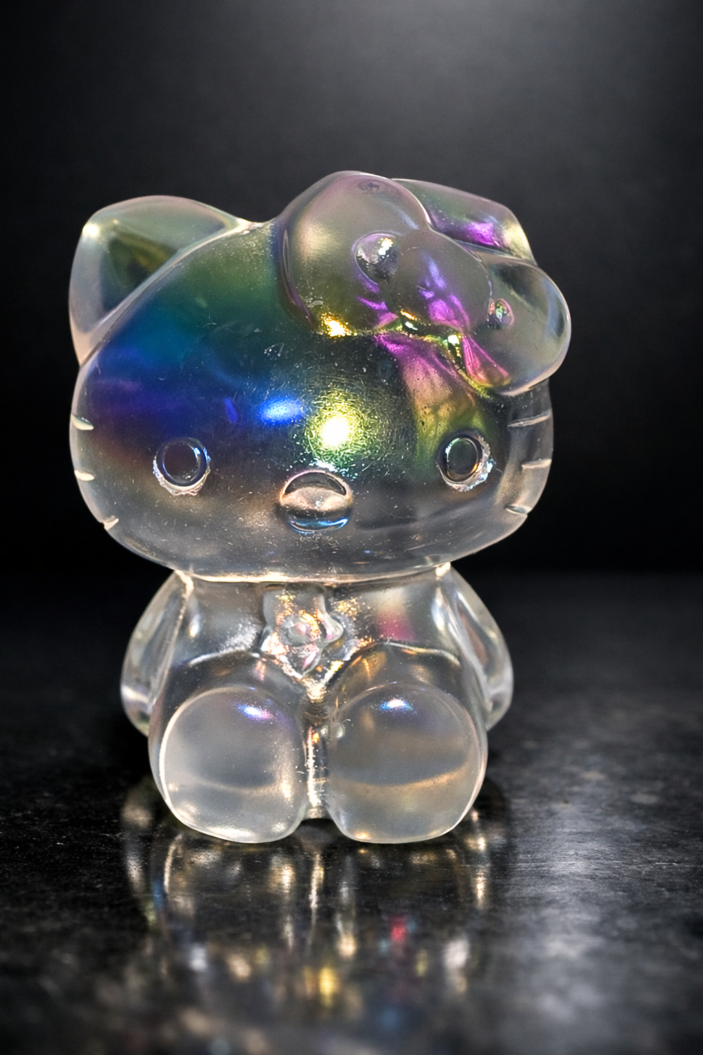 Adorable meets iridescent sparkle. This Aura Quartz Hello Kitty carving is made from natural quartz enhanced with a metallic vapor coating, giving it a beautiful rainbow sheen that shifts in the light.