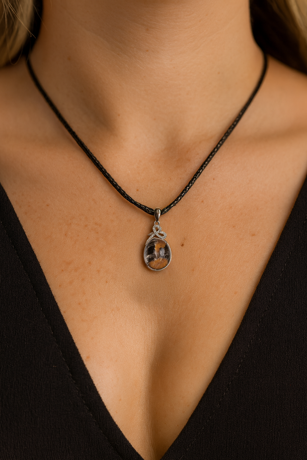 Mesmerizing Garden Quartz pendant — each stone a natural work of art, capturing an entire miniature landscape inside crystal. Features earthy tones of gold, brown, and charcoal suspended in clear quartz. Set in a sparkling rhodium-tone halo with high-clarity cubic zirconia detailing. Comes on a black braided cord necklace for a chic, earthy-luxury vibe. (18-20 inches) Size: approx. 35 × 25 mm cabochon Symbolizes growth, grounding, and harmony with nature . Each pendant is one-of-a-kind — no two are ever alike.