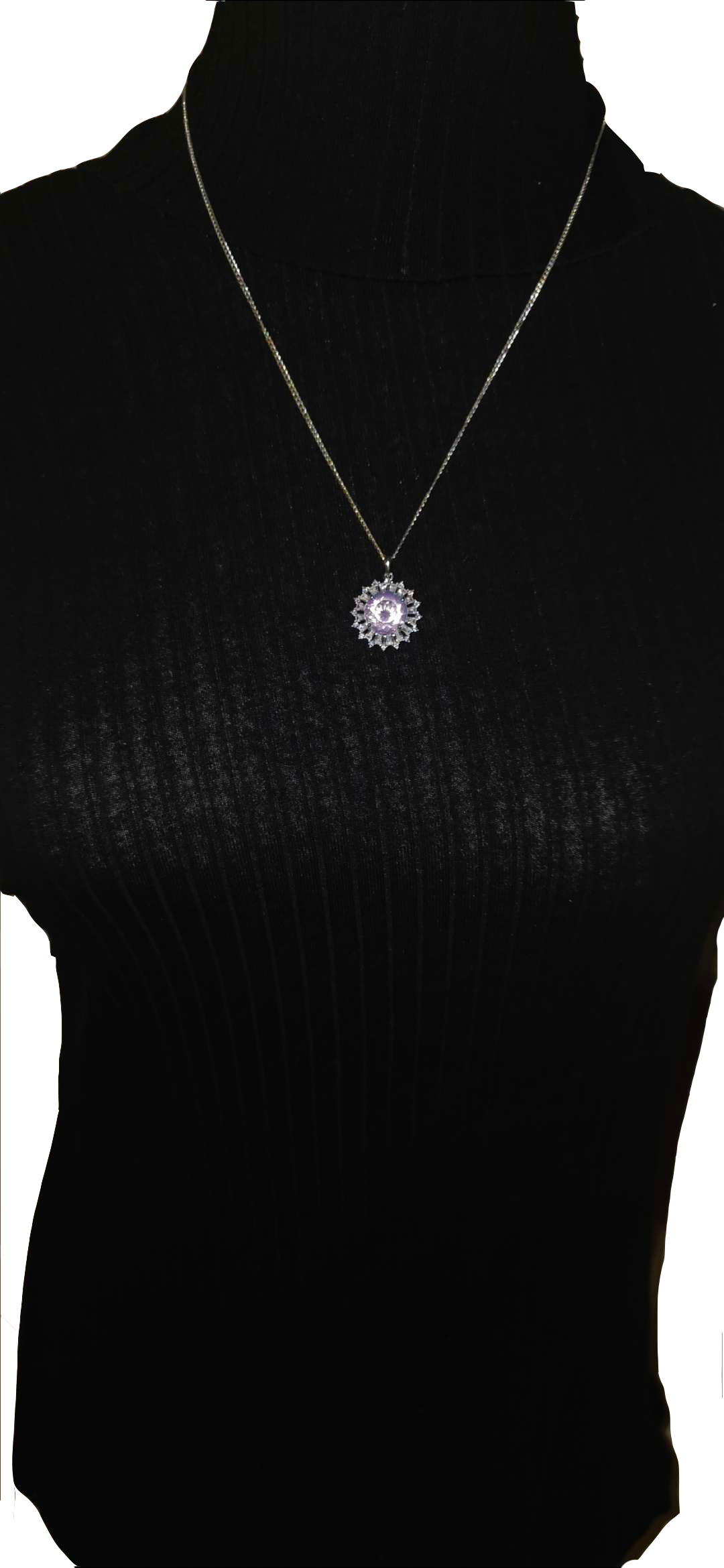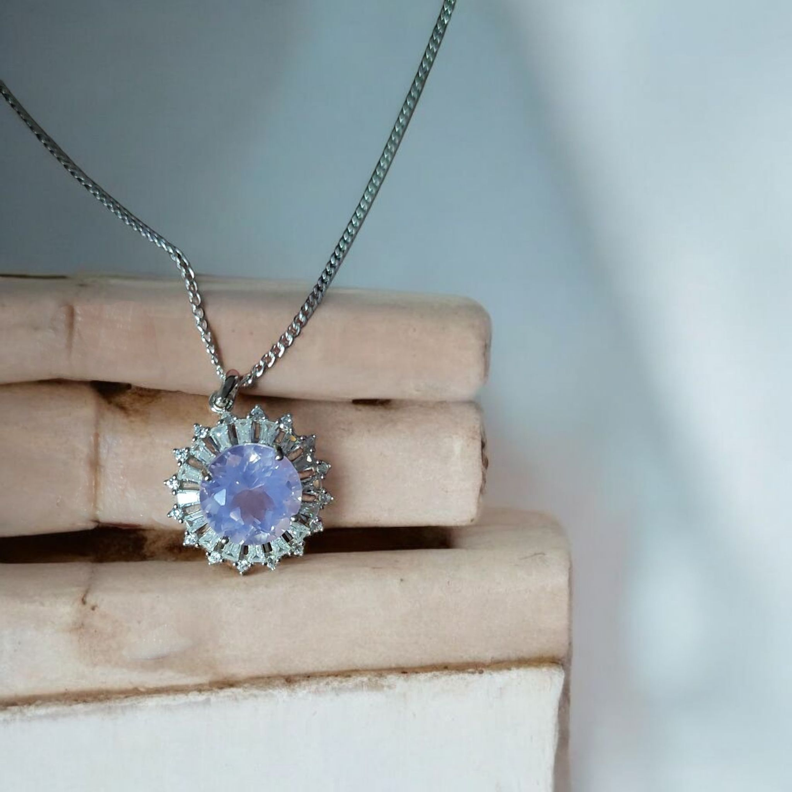 This elegant necklace features a round-cut Lavender Quartz centerpiece with a soft lilac glow and natural internal texture that sparkles beautifully under light. The stone’s gentle lavender hue gives it a dreamy, romantic presence. Surrounding the center gem is a luxurious halo of clear baguette-cut and round CZ stones , arranged in a starburst pattern to maximize brilliance. The combination creates a high-end, vintage-glam look that stands out instantly. Details Center Stone: Lavender Quartz Cut: Round brilliant, approx. 10–12 mm Halo: Clear baguette + micro round cubic zirconia Metal: 925 Sterling Silver pendant + 925 Sterling Silver chain Pendant Size: approx. 20 mm tall (including bail) Chain Length: approx. 18–20 inches Why You’ll Love It Made with solid 925 Sterling Silver — durable, tarnish-resistant, and hypoallergenic Light-reflective lavender quartz with a soft, calming glow Sparkling halo design for a luxury feel without the luxury price Perfect for daily wear, special events, or gifting Lavender Quartz Meaning Lavender Quartz is believed to bring: 💜 Emotional healing & inner peace 💜 Stress relief & calm energy 💜 Gentle protection 💜 Heart-opening vibration for love and harmony